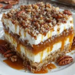 Refrigerate for at least 4 hours or overnight before serving. Chilling lets the layers set firm and makes slicing cleaner. Just before serving, you can drizzle extra caramel and add a few more toasted pecans for shine and crunch.