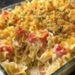 A warm, cheesy family favorite blending tender egg noodles, shredded chicken, creamy soup, and melty cheddar into a simple, comforting casserole.