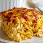 A comforting dish featuring a rich blend of chicken, pasta, and creamy sauce topped with melted cheese, perfect for family dinners or potlucks.