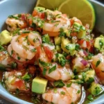 A bright and fresh ceviche made with shrimp, lime juice, and fresh vegetables, perfect for a light meal or appetizer.