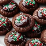 Chocolate Thumbprint Christmas Cookies are rich, chocolatey little bites that are perfect for holiday plates and cookie exchanges. They have a soft, buttery texture with a deep cocoa flavor, and each cookie cradles a glossy spoonful of chocolate in its center. Bright sprinkles or chopped nuts add a festive crunch and color that make these cookies feel special. They smell like cocoa and butter while baking and melt pleasantly on the tongue.