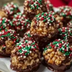 Delightful chocolate-coated Rice Krispie balls, perfect for holiday gatherings.