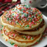 Fluffy and sweet Christmas pancakes adorned with colorful sprinkles, perfect for holiday breakfasts or brunches.
