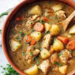 This cozy chicken stew smells like home — warm broth, soft herbs and tender chicken. It’s an easy one-pot meal that fills the house with savory, herb-scented steam. The broth is silky, the potatoes melt in your mouth, and the peas add a bright pop of color and sweetness. It’s a perfect weeknight dinner or a simple meal for guests.