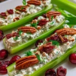 These celery boats come together fast. You need no oven. They balance textures: crisp celery, smooth cream cheese, chewy cranberries, and crunchy pecans. They look festive with red cranberries and green celery. They work as a healthy-ish snack and as an easy appetizer at gatherings. They also hold up well on a party tray for a few hours.