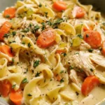 Warm, creamy, and comforting, this creamy chicken noodle soup features tender shredded chicken, soft egg noodles, and a silky broth flavored with sautéed vegetables and thyme.