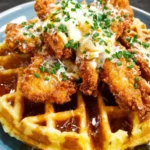 This dish is fast, satisfying, and crowd-pleasing. The contrast of textures — crunchy chicken and tender waffle — makes each bite exciting. It’s perfect for weekend brunch, a fun family dinner, or when you want comfort food with a bit of flair. The recipe uses simple pantry spices and a boxed waffle mix to keep it approachable, while the buttermilk soak adds tang and tenderizes the chicken.