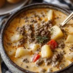 This creamy, comforting soup combines ground beef, potatoes, and cheddar cheese for a rich and satisfying meal, all cooked conveniently in a slow cooker.