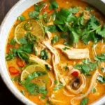 This Easy Thai Chicken Curry Soup is creamy, bright, and quick to make. It mixes warm coconut and red curry flavors with tangy lime and fresh cilantro. The broth smells fragrant of coconut and spice. The chicken stays tender and the vegetables add a light crunch. This bowl is cozy, colorful, and ready in about 30 minutes. If you like Thai-style soups, you might also enjoy a similar twist like this Thai red curry dumpling soup.