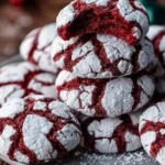 These fudgy red velvet crinkle Christmas cookies are soft, slightly chewy, and festive, revealing a rich cocoa flavor and a tender, fudgy center.