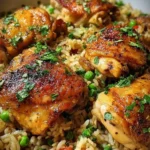 A warm, comforting one-pot chicken and rice dish that combines browned chicken, fragrant onions and garlic, tender rice, and bright green peas.