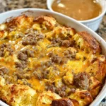 This casserole saves morning time because you assemble it the night before. Croissants give the bake a flaky, buttery texture that turns slightly crisp on top while staying soft inside. The egg custard keeps it creamy, and the gravy adds a savory finish. It’s perfect for holidays, a relaxed weekend breakfast, or feeding a small crowd. The aroma while baking — warm butter, melted cheese, and savory meat — draws people to the table.