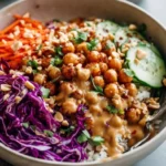 This bowl is fast, filling, and full of texture. Chickpeas give you plant protein and a slightly nutty taste. Quinoa adds a light, fluffy grain base. Mixed greens and crisp veggies bring color and crunch. The peanut dressing is creamy, tangy, and a little sweet, which ties everything together. It’s great for busy days and for people who want a balanced, satisfying meal without fuss.