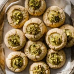 These pistachio thumbprint cookies feature a buttery dough with a soft jam-filled center and a nutty crunch from chopped pistachios.