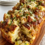 Pull-apart stuffing bread is a cozy, shareable loaf that combines soft bread, savory stuffing, melted cheese, and buttery herbs. It smells warm and garlicky as it bakes, with a golden crust and gooey cheese between the slices. This easy crowd-pleaser is perfect for weeknight dinners, potlucks, or holiday sides.
