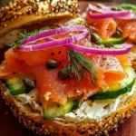 A warm, tangy smoked salmon bagel sandwich featuring crisp, toasted bagel, smooth cream cheese, smoky salmon, sharp red onion, and a pop of salty capers.