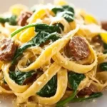 A rich and creamy pasta dish featuring savory Italian sausage, fresh spinach, and decadent Alfredo sauce, perfect for any occasion.
