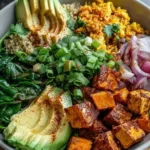This tofu scramble vegan breakfast bowl is bright, savory, and easy to make, featuring crumbled tofu, sautéed vegetables, and creamy avocado.