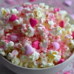 A quick, festive snack that combines sweet, creamy white chocolate with crunchy popcorn and colorful candies, perfect for sharing on Valentine’s Day.